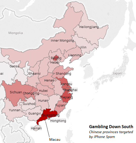Like the US, it is not the phone number’s actual location, but it is a good guide to see what areas are of primary focus. While it is generally spread out by region, we can see that the largest numbers of attacks are targeted to iPhones registered with phone numbers from Guangdong province in the south. This province is China’s most populous, but it is targeted much more than would be expected. One reason could be that Guangdong borders Macau and Hong Kong. This fits into the pattern for the recent change of iMessage spam to include advertising of gambling sites, as most, if not all of these are based in Macau. While gambling is officially illegal in China, Macau’s gambling industry is many times the size of Las Vegas, and so iPhone users from Guangdong may be disproportionally targeted as the spammers may want to focus on people from neighbouring areas.